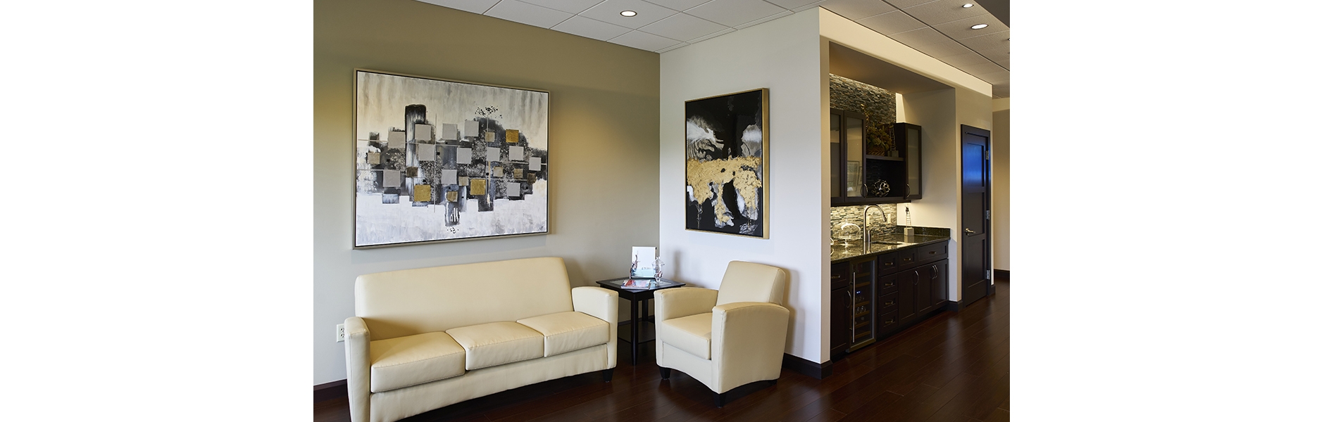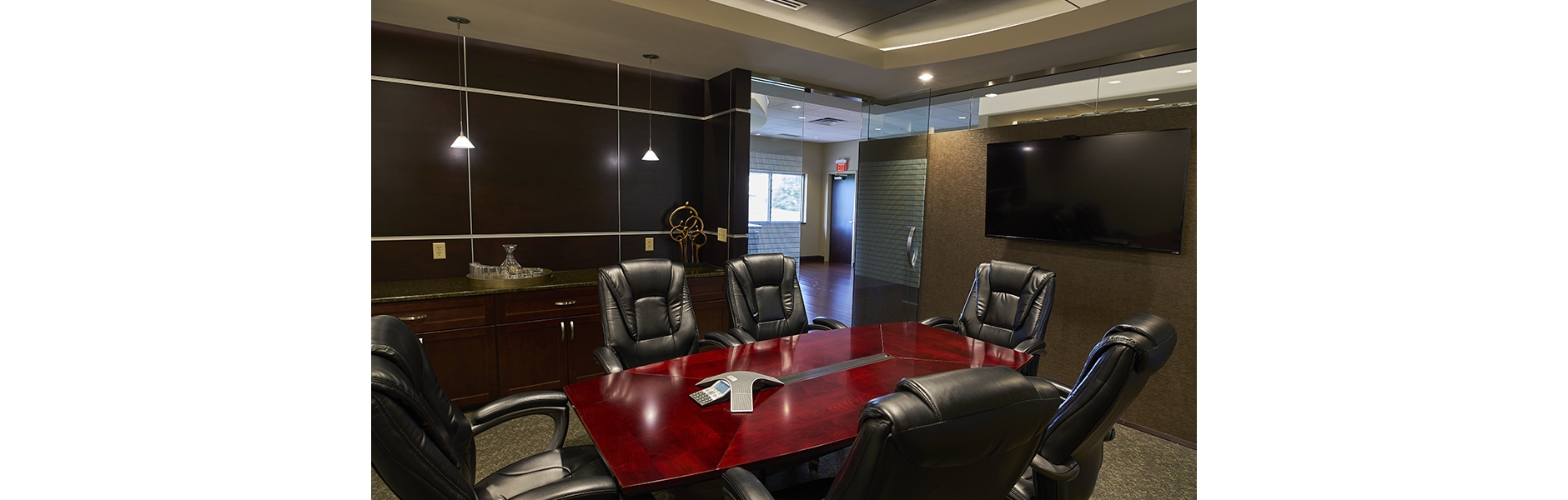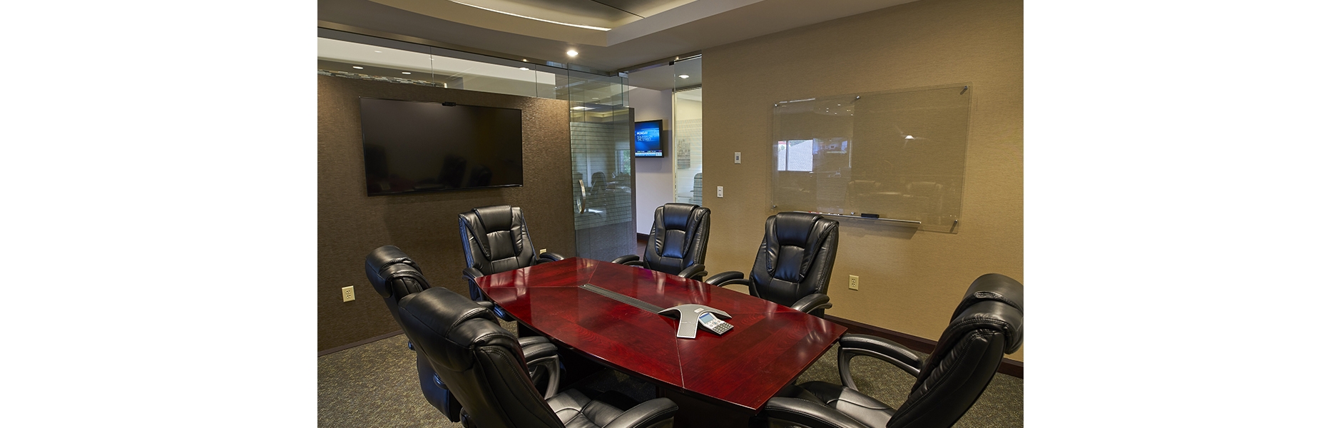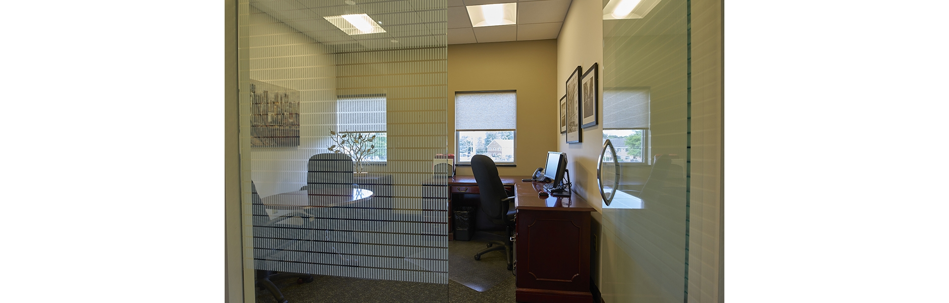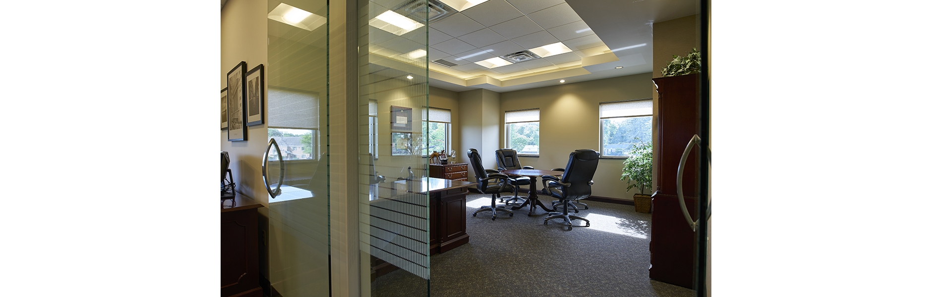 The suites boast private offices and conference rooms that make use of full height glass doors, permitting natural daylight from the existing perimeter fenestration into centrally located core spaces. Creative design in collaboration with the owner and a local builder provided a project that was delivered successfully on schedule for less than $100 / sq.ft.