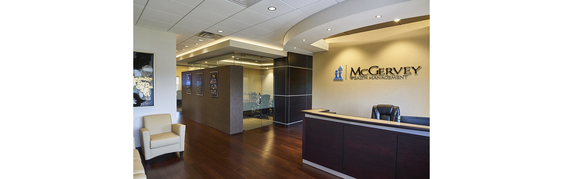 McGervey Wealth Management hired Structura to Design, Bid, and assist with Construction Administration of a penthouse suite tenant improvement for their new corporate headquarters in North Canton, Ohio. Structura designed the 3,770 square feet suite around the existing building’s common lobby, egress pathways, and fenestration pattern. The program required the penthouse suite to be divided into two autonomous suites (2270 sq.ft. / 1500 sq.ft.) that are designed to assimilate into one suite as McGervey’s business plan expands.